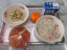 今日の給食は、6年生が家庭科で考えた献立が提供されました。クラムチャウダーが甘めのパンと絶妙にマッチしていて、ツナサラダには粒マスタードが効いて絶品でした。栄養バランスも抜群で、心も体も大満足です。ごちそうさまでした。