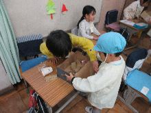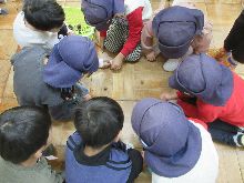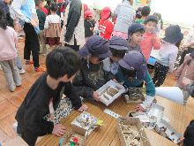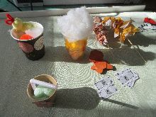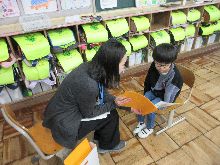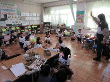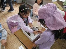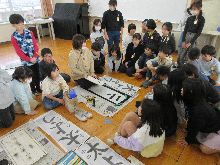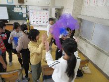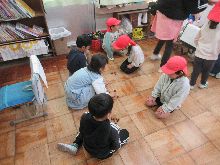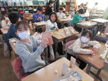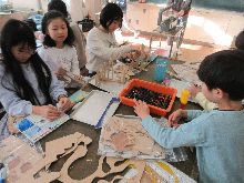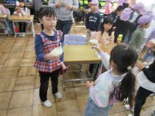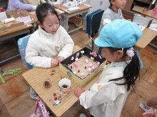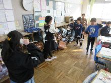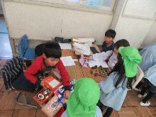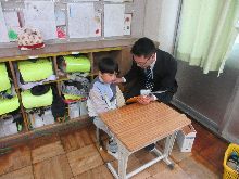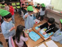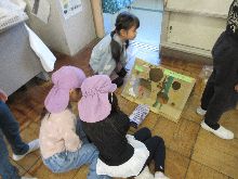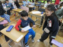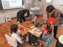 1年生が近隣の幼稚園、保育園の年長さんを招いて、「秋のお楽しみ会」を行いました。各クラスでグループに分かれて、ドングリや落ち葉など「秋のアイテム」を使っておもちゃを作り、年長さんを楽しませるためのお店の準備を行ってきました。おもちゃを作るときは、安心して遊んでもらえるように丈夫に作る工夫をしていました。また、遊び方をわかりやすく説明できるように、役割を分担したり案内の原稿を準備したりと、この日が来るのを待ちわびていました。そしていよいよ迎えた本番。初めは年長さんが見ていても緊張しているのが分かるほどでしたが、1年生が一生懸命声掛けをしていろいろ教えてあげると、どちらも笑顔がこぼれて教室中が楽しい空気でいっぱいになりました。みんなが楽しんでくれている様子から、ますます1年生も生き生きと対応することできました。年下の子のために、おもちゃ作りやお店の計画などの準備から今日のの運営までさまざまな経験は、教科書からは学べない貴重な活動でした。ご協力いただいた園の皆様に感謝申し上げます。そして、来年入学してくる年長さんは、元気に笑顔で来てくれることを楽しみにしています。