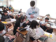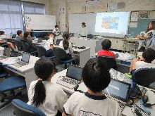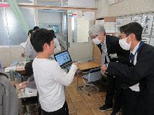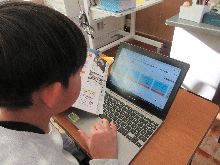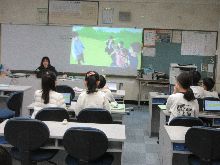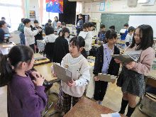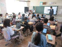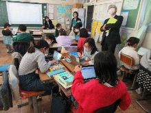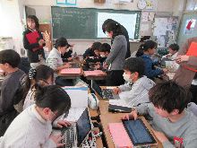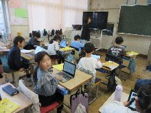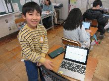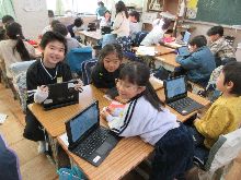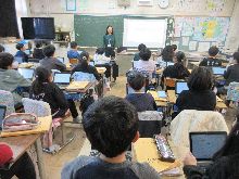 タブレット端末が導入されて5年目。今や毎日使う文房具の一つとして定着しています。5年生が社会科で調べ学習を進めているときに、他者参照(友達のカードを自由に閲覧)をして自分の考えに活かしていました。1年生は国語で、自分の考えを書いたカード(画面)をグループの仲間に発表していました。4年生はGSで、日本で自分の好きな季節をALTに紹介するプレゼンを作成・発表していました。3年生は体育で、技のでき具合の確認を互いに撮影し合っていました。どの学年でもどの教科でも、欠かせない道具となっています。これからもよりよい教育活動の実現を目指して、指導法について研修し研鑽してまいります。