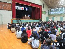 まず、体育館に全員が集まって終業式を行いました。すべての学年が静かに体育館へ移動し、式が始まるまで静かに待つことができました。式に臨む態度も大変立派でした。私から子ども達に3つのお話をしました。