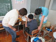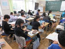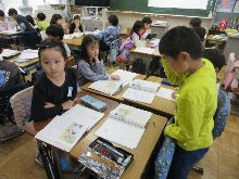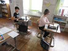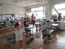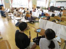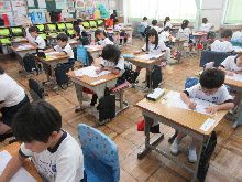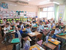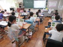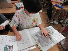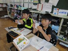 1年生の国語は「はたらくじどう車」で、初めての説明文です。様々な車のはたらきと形について本文を読み取ってまとめていきます。最後は自分で選んだ車について、図鑑のようにまとめていきます。本物の図鑑で熱心に調べる様子に意欲の高さが感じられました。また、学級活動で係の報告会を行うクラスもありました。みんなを楽しませるために、様々な工夫や努力をしていました。「みんなのために」の行動が素晴らしいです。4年生も3年生も社会科で、自分が調べたことについて報告し合ったり相談したりして、自分の考えを広げたり深めたりしていました。面白かったのが6年生の書写で、4つの手本から好きな言葉を選び、4人が机を合わせて互いにどんな様子で書いているのか見合いながら取り組んでいました。素敵な言葉を囲んで、互いに声を掛け合いながら取り組む様子から、仲のよさが感じられました。グループ等で学ぶ形には、いろいろなメリットがあることを再確認しました。一方、2年生は作文で、たくさんのメモの付箋を並び替えながら、文章を書き進めていました。一人で頑張ることも大事です。6年生の国語は教頭先生が担当しています。身近なところをふりかえり、「なぜこのきまりがあるのか」等の主張をするために質問案を考えて、その理由を学校の中で該当する教職員に聞きに行く学習をしています。考えた案を教頭先生に聞いてもらい、指摘された点を深めたり調べ直したりして案を整えています。校長室にきて「なぜシャーペンはだめなのか」「なぜ通学は歩きなのか」などの質問を受けました。私の回答を聞いて、納得してくれたようですが、「なぜ?」と思うことは大切なことだと思います。4年生が体力向上のための運動に取り組んでいます。ジャンプロープ?は珍しい器具で、私はほかの学校では見たことがありません。雲梯や上り棒、タイヤなどを使っていろいろな動きを取り入れ、丈夫な体にしていきましょう。