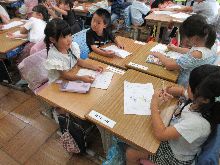 2,3,4年生が「書く」に関わる活動に取り組んでいました。互いに見せ合ってよいところを参考にしたり、頑張って作った下書きを先生に添削してもらったり、お勧めの本を紹介するために心に留まった表現を抜き出したり、自分の考えを文章でよりよく表すために様々な工夫が施されていました。今の自分がもっている力が土台となり、今の活動で取り組んだことがさらに土台を強くして、技能が高まっていきます。最後まで「よりよく」する意識を大切にしてほしいです。図工では、1年生が紙とハサミをつかって、4年生は板とノコギリをつかってそれぞれが立体作品をつくっています。それぞれの素材の特徴を活かして、自分の作品の特長に仕上げています。「やってみよう」という気持ちが育っていることがよく感じられました。GSでは、全部英語で話すALTの話をしっかり聞いて同じ言葉を繰り返す2年生、自分の好きなもの(人)について特徴や好きな理由をタブレットを使ってカードにまとめる6年生と、発達段階に応じた活動を行っていました。