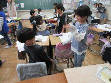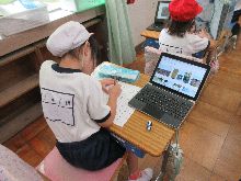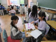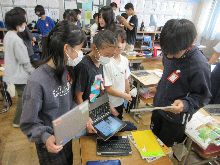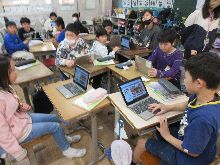 さて、今日も6年生のミシン学習で保護者の方のサポートをいただきました。布送りがうまくいかずに糸が固まってしまったのをほぐしていただいたり、縫い間違えてしまった箇所をほどいていただいたりと、これまで以上に助けていただきました。もうすぐ完成ですので、これまで以上に完成に向けて丁寧な作業をしてください。同じく6年生図工で、描いた絵の鑑賞をしていました。互いの作品の感想を付箋紙に書いて渡していました。目の前で書いたものを直接渡される嬉しさが伝わってきてよかったです。一方5年生の社会科では、貿易にについてまとめたシートをクラウド上で見合い、コメントを記入(入力)していました。場所を移動せずに、同時に複数のシートを見て作業ができるよさを上手に活かしています。感想の伝え方は、時と場合によって選ぶことが大切です。2年生は、1年生とやった遊びまつりを2年生同士で行いました。やはり、みんなが作ったおもちゃが気になっていた様子がよく伝わってきて、夢中で遊んでいました。接客も上手になっていました。経験したことが生かされていますね。