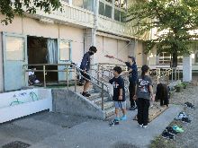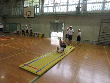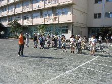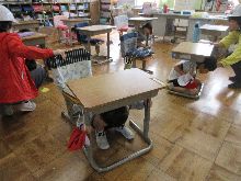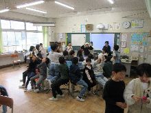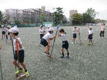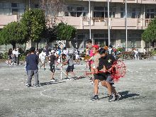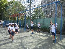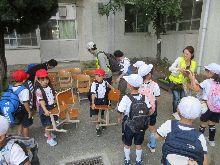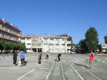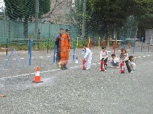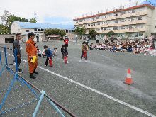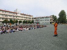 3年生が竹馬の練習をしてました。乗れる子はごく僅かでしたが、教え合いながら楽しく練習に励んでいました。途中で私も参加させてもらいました。私なりにコツを伝えると、上手にバランスをとり、だんだん乗れる時間が長くなった子がいました。手ごたえを感じたようで、さらに頑張って練習してくれました。また、全校で避難訓練を行いました。地震発生の放送を聞くとすぐに机の下に隠れたり、消防施設のサイレンがなり校内放送が流れるとしっかりと聞いて、先生の指示に従って静かに速やかに避難行動をとることができました。消防署の方のお話にもしっかりと耳を傾けて聞くことができました。その後の模擬消火訓練でも、消火器の使い方や火事を見つけた時に119番通報や消火器を持ってくることを依頼する流れを教えてもらいました。