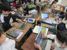 4年生の図工では、板で組み立てた作品に色付けをしていました。立体に色を塗る活動は、画用紙などの平面に塗るものとはまた違った楽しさと難しさがあります。自分の好きな色を作って丁寧に塗って素敵な作品に仕上げていました。また、よさこいソーランの出来ばえを評価するために、少人数に分かれて踊っていました。大きく腕や体を使ってダイナミックに踊ることができていました。練習を重ねた成果を感じました。さらに、理科「空気と水」で空気でっぽうを使って空気の特徴を確認しました。スポンジの栓が飛び出すときの「ポンっ」という乾いた音が校庭中に響いていました。運動会が終わったばかりですが、6年生は音楽会の合奏練習に取り組んでいました。楽器の分担もされており、すでにメロディーが整っている感じがしました。本人たちはまだまだだと思っているようなので、本番までにどこまで高められるか楽しみです。5年生のミシンで今日もお手伝いいただきました。いつもいつもありがとうございます。5年生は算数で、自力解決の方法を、様々な中から自分で選んで取り組んでいました。友達と一緒に考えたり一人でチャレンジしたりと、自分に合わせて学べる環境で頑張っています。1年生が漢字の練習をタブレットでしていました。アプリの起動から練習に取り組むまで、戸惑うことなくスムーズに行えています。本当に身近な道具になっていますね。ブックワールドでは「読書の秋」に相応しく、静かに自分の好きな本を選んで読みふけっていました。親子で同じ本を読んで感想を伝え合う取組が好評だという話を聞いたことがあります。11月には読書週間もありますので、よろしければ取り組んでみてください。よい気候ということで、休み時間にはこれまで以上にたくさんの子ども達が外遊びを楽しんでいました。冬になるにはまだ早すぎなので、小春日和を楽しめる日が長く続くことを祈ってます。