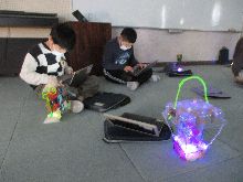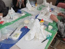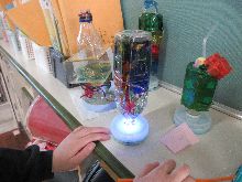 4年生 図工 透明な材料を組み合わて作った作品の下に ライトを入れて光らせました。