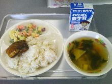 今日の給食も6年生考案メニューでした。サバの味噌煮と豆腐とタケノコのスープ、サイコロサラダで、たんぱく質や野菜たっぷりで地産地消を意識した内容でした。素晴らしい&おいしい!でした。