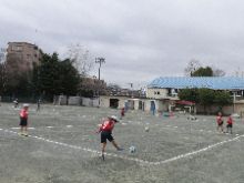 【2年体育】 サッカー遊びで、パスとトラップの練習をしていました。 ペアで声を掛け合いながら、楽しく取り組みました。 上手に蹴るコツに気づき、教えてくれました。 |