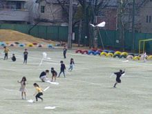 1年生 自分で作った凧で、凧あげをしました。 風を上手にとらえて、 みるみる舞い上がっている様子です。 |