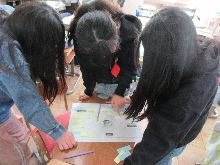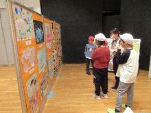 会場でもグループ毎に仲よく見学できました。ディスプレイされた自分たちの作品に、嬉しそうな表情が溢れていました。また、ほかの学校の作品にも熱心に見て回り、「すごいね」「きれい」「かっこいいな」など、感嘆の声が漏れ聞こえてきました。